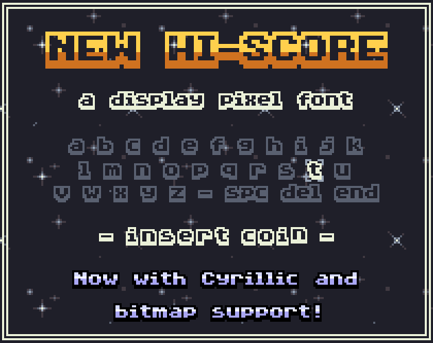 New HiScore is a pixel art typeface that captures the nostalgic aesthetic of early arcade games, when hardware and software limitations required bold, blocky characters. With a thick outline giving it volume and tridimensionality, it's a great font for texts that are supposed to stand out on a screen and feels right at home in a high-score leaderboard or a "Press Start" screen.